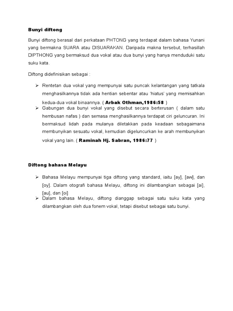 Bahasa Melayu bahasa Arab vokal diftong fonologi. Alat bicara yang ada dalam tubuh manusia menghasilkan bunyi bahasa. Bahasa Melayu mempunyai tiga jenis diftong iaitu ai au dan oi.